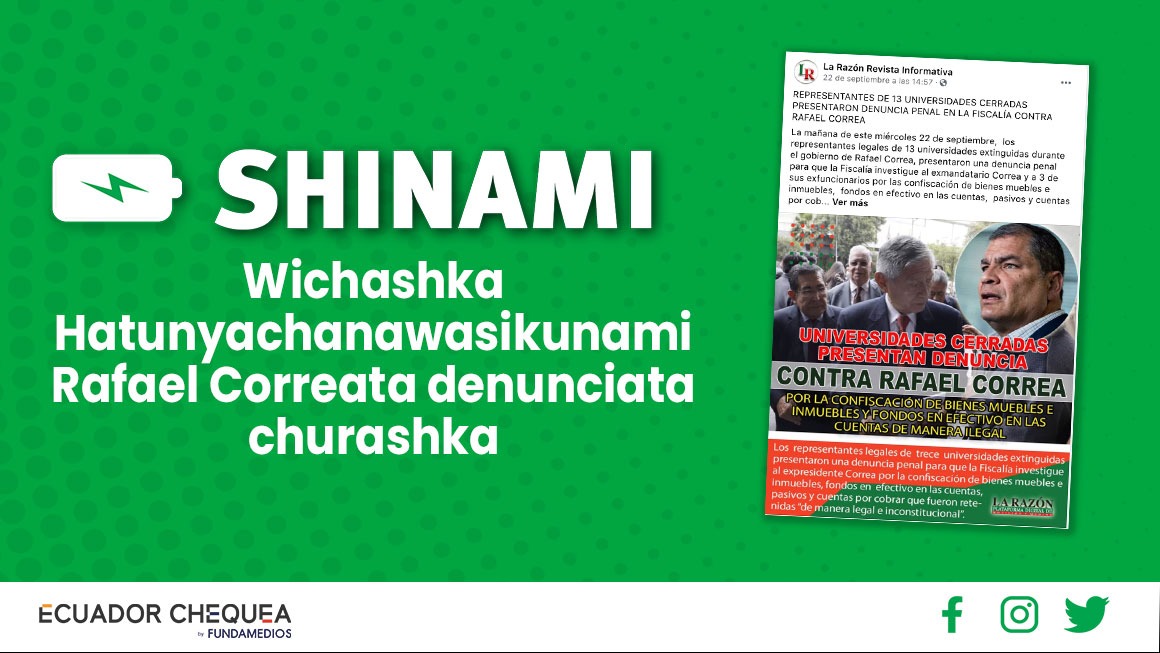 22 kuski killapi 2021 watapa, facebookpi shuk willayta llukchirka Hatunyachanawasikuna wichashkakunami Rafael Correaman huchachita churashka. Chay rikachapika 13 hatunyachanawasimantami Fiscaliapi hucahticha churashka Correata taripayta rurachun. Chayka shinami kan.