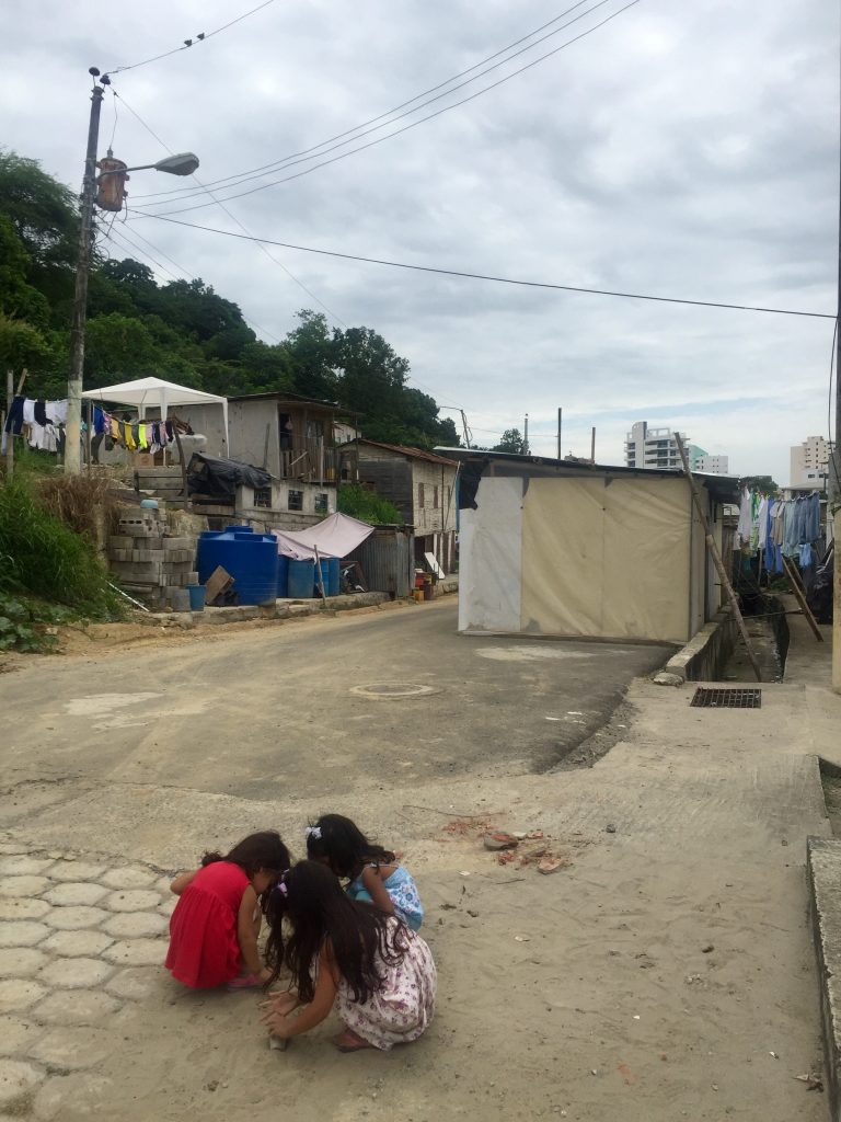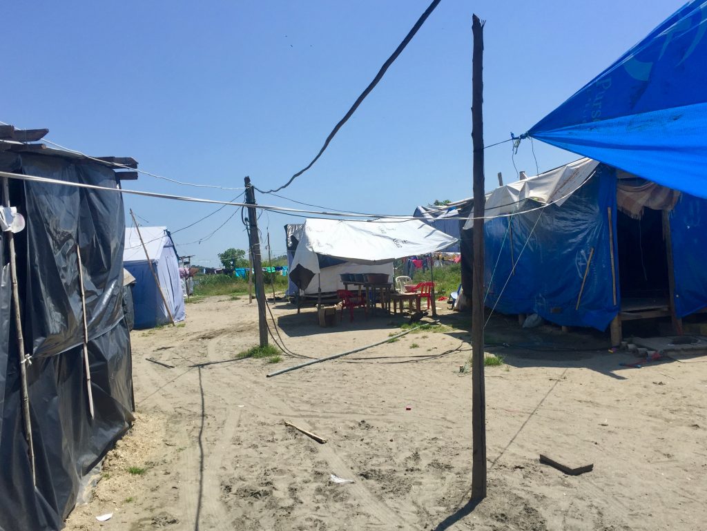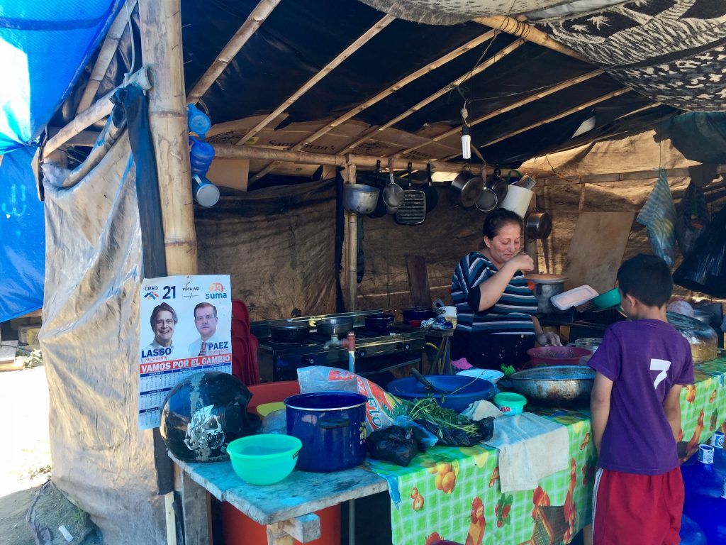 Entonces se emprende el camino hacia La Chorrera para constatar los avances en las promesas. La comuna queda a 2km de Pedernales. Al llegar, al borde de la carretera se observa una especie de conjunto habitacional, donde se levantan casas de caña guadua y cemento; ahí opera maquinaria de construcción. Se ingresa por una vía asfaltada y al continuar la ruta aparece un ‘campamento’. Hay niñas, niños, mujeres, hombres viviendo en comunidad entre palos de caña, madera y plásticos desde donde se resguardan de la intemperie: el sol, la lluvia… el polvo y el lodo no se puede ‘esquivar’.