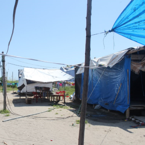 Entonces se emprende el camino hacia La Chorrera para constatar los avances en las promesas. La comuna queda a 2km de Pedernales. Al llegar, al borde de la carretera se observa una especie de conjunto habitacional, donde se levantan casas de caña guadua y cemento; ahí opera maquinaria de construcción. Se ingresa por una vía asfaltada y al continuar la ruta aparece un ‘campamento’. Hay niñas, niños, mujeres, hombres viviendo en comunidad entre palos de caña, madera y plásticos desde donde se resguardan de la intemperie: el sol, la lluvia… el polvo y el lodo no se puede ‘esquivar’.