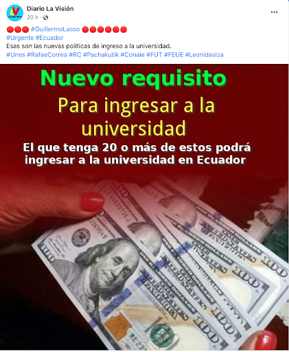 En Facebook circula una publicación en la que se asegura que, después de haberse eliminado el examen estandarizado para ingresar a las universidades públicas, el nuevo requisito para acceder a la educación superior es tener veinte o más billetes de cien dólares. Se dice en el post también que esa será la nueva política que reemplazará a la antigua. Esta información es falsa.