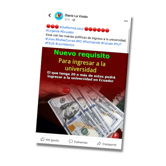 En Facebook circula una publicación en la que se asegura que, después de haberse eliminado el examen estandarizado para ingresar a las universidades públicas, el nuevo requisito para acceder a la educación superior es tener veinte o más billetes de cien dólares. Se dice en el post también que esa será la nueva política que reemplazará a la antigua. Esta información es falsa.