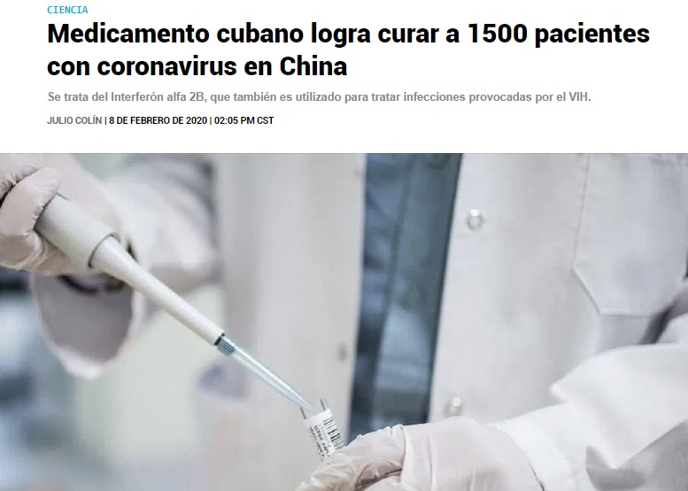 Esta publicación engañosa en torno al Gobierno cubano tiene raíz en un hecho real anunciado por isla el pasado 5 de febrero. Ese día, la Embajada de Cuba en China informó que una planta, fruto de la cooperación chino cubana en tecnología, produce el medicamento Interferón alfa (IFNrec) en la ciudad de Jilin. El antiviral fue uno de los 30 fármacos escogidos por la Comisión Nacional de Salud China para combatir el COVID 19.
