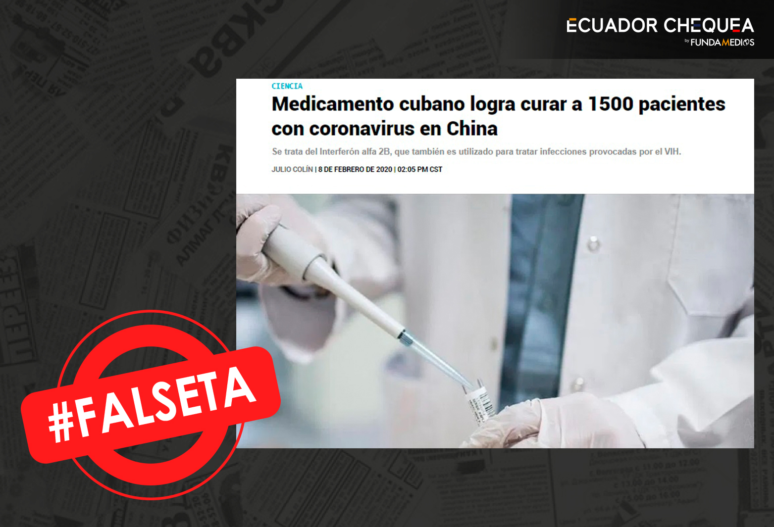 En redes sociales se afirma que el Interferón Alfa 2B es el responsable de curar a 1500 pacientes del COVID 19 en China. Esto es mentira. El antiviral cubano es solo uno de los 30 medicamentos que se emplean en la lucha contra el virus. La falsedad surge de una interpretación errónea del sumario del artículo compartido por Díaz-Canel el 7 de febrero: