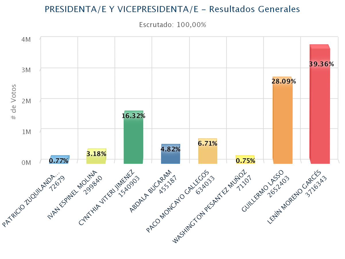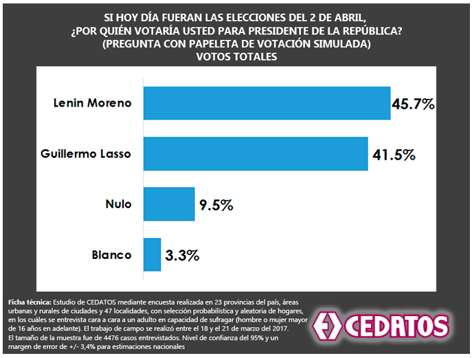 En ese contexto, el martes pasado la encuestadora presidida por Polibio Córdova publicó datos respecto a la Segunda vuelta: Decisión y Simulación de intención de votos. Esa información indica que Lenín Moreno (Alianza PAIS) obtendría 45,7% de la votación, frente a un 41,5% de Guillermo Lasso.