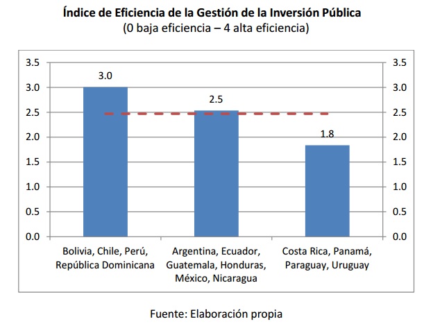 Por su parte, el Banco Mundial, en su informe sobre ‘El gasto de inversión pública en América Latina: cuánto y cuán eficiente’, elaboró un índice de eficiencia de la gestión de la inversión pública en América Latina. Este índice se encuentra entre 0 y 4, donde 0 es sinónimo de baja eficiencia, y 4 de alta eficiencia. Ecuador fue calificado con 2,5 situándose en un rango medio de eficiencia, por debajo de Bolivia, Chile, Perú, República Dominicana que fueron calificados con 3.