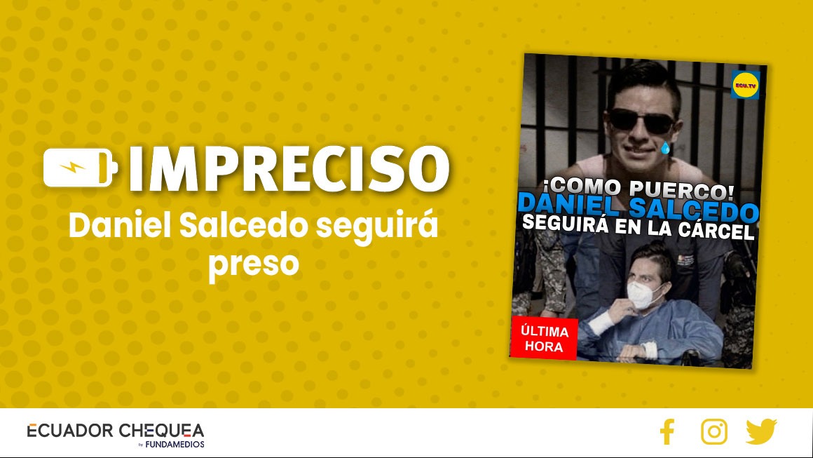 Uno de los personajes emblemáticos de la peor parte de la pandemia es Daniel Salcedo, vinculado a casos de venta de medicamentos con sobreprecios a hospitales públicos en Guayaquil durante la pandemia. Y en estos días se publicó un post que asegura que Salcedo, quien había pedido medidas sustitutivas, seguirá preso. La información es imprecisa. El tribunal que lleva el caso le informó a Salcedo que su solicitud de arresto domiciliario está incompleta y debe ser completada para ser tramitada, pero a los otros 3 solicitantes vinculados al caso, entre ellos su hermano, la medida ya se les negó. Sin embargo, en su caso, el proceso sigue abierto.