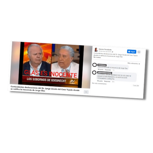 En el marco del reciente hábeas corpus que le devolvió la libertad al exviepresidente Jorge Glas, pese a tener dos sentencias ejecutoriadas por los delitos de cohecho y asociación ilícita las desinformaciones van por todo lado. Por ejemplo, se publicó en una cuenta de Facebook de nombre Gracias Presidente —cuya foto de perfil es la de Rafael Correa—, declaraciones del abogado Jorge Zavala, en las que asegura que Glas es inocente. La información es falsa, porque Zavala no defiende a Glas. De hecho, esas declaraciones fueron dadas por Zavala en 2019, para defender a Tomislav Topic, quien negó haber dado sobornos al convicto Jorge Glas.