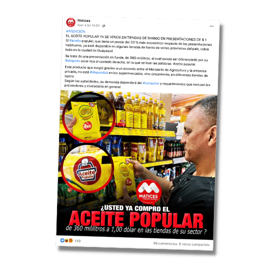 El Gobierno estableció un acuerdo con la Asociación de Productores de Grasas y Aceites para comercializar un aceite a precio popular. Este producto tendrá un precio menor con respecto a los que se comercializan actualmente en los principales mercados del Ecuador y tendrá como soporte la materia prima que proviene de la palma africana. En Facebook, circula una imagen, en la que asegura que el aceite popular cuesta $1 y su contenido es de 360 ml. Esta información es cierta y es una de las variedades que se ofrecerán al público. Este aceite es distribuido por la empresa DANEC y en la funda se observa el etiquetado de ‘aceite popular’.