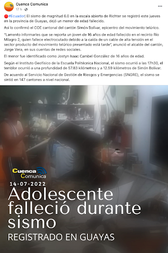 Una publicación de Facebook asegura que un adolescente habría muerto electrocutado debido a la caída de un cable de alta tensión, producto del movimiento telúrico. Esta información es cierta.