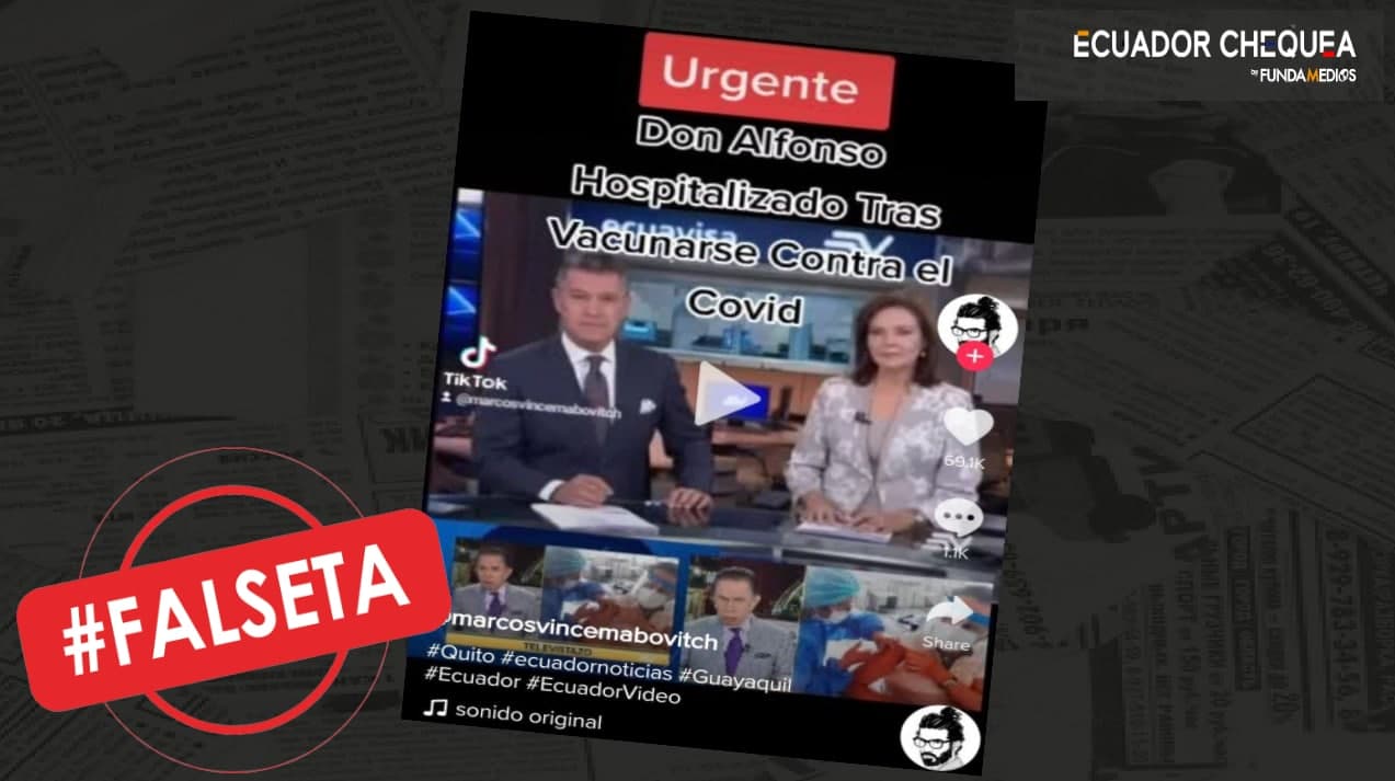 Un video viralizado en tik tok asegura que el periodista Alfonso Espinosa de los Monteros “sufrió un quebranto en su salud”, además contiene el titular “Don Alfonso hospitalizado tras vacunarse contra el covid”. Las afirmaciones son falsas. El video ha sido tomado de un informativo de Ecuavisa, de octubre de 2017; varios colegas del periodista desmintieron el rumor y confirmaron que Espinosa de los Monteros se encuentra bien de salud.