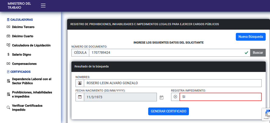 – Registro público del Ministerio de Trabajo sobre impedimentos para ejercer cargos públicos.
