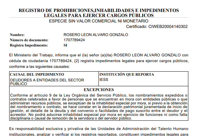 Ecuador Chequea revisó manualmente el registro de impedimentos del Ministerio de Trabajo. El sistema arrojó que Rosero mantiene un impedimento para ejercer funciones públicas por ser deudor del Instituto Ecuatoriano de Seguridad Social (IESS). El certificado oficial tiene fecha 19 de noviembre de 2025. Esta información coincide con los parámetros de consulta pública disponibles en la plataforma estatal.