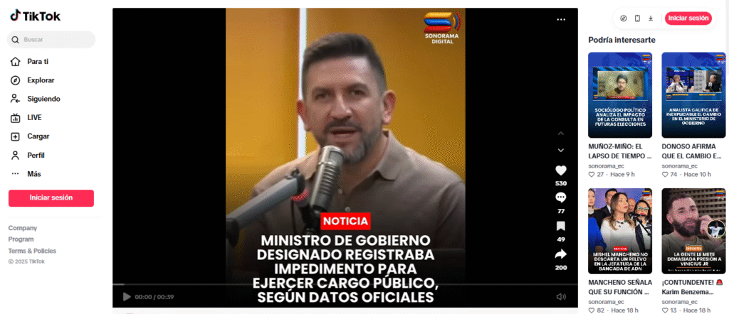 En TikTok circula un video que sostiene que Álvaro Rosero León —periodista y nuevo ministro de Gobierno designado por el presidente Daniel Noboa— no puede ejercer cargos públicos debido a un impedimento vigente.