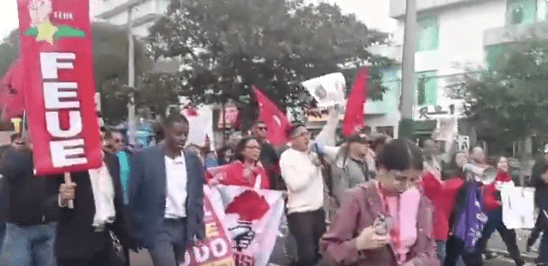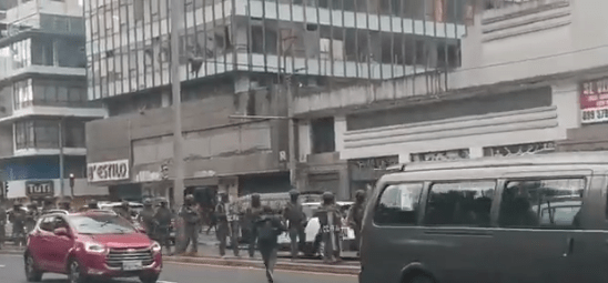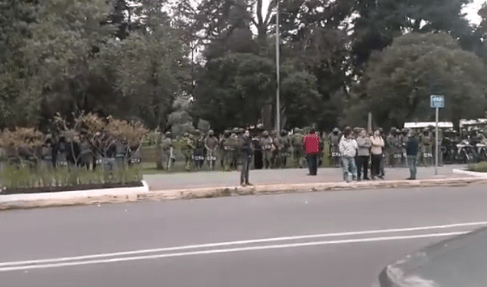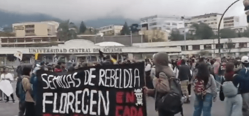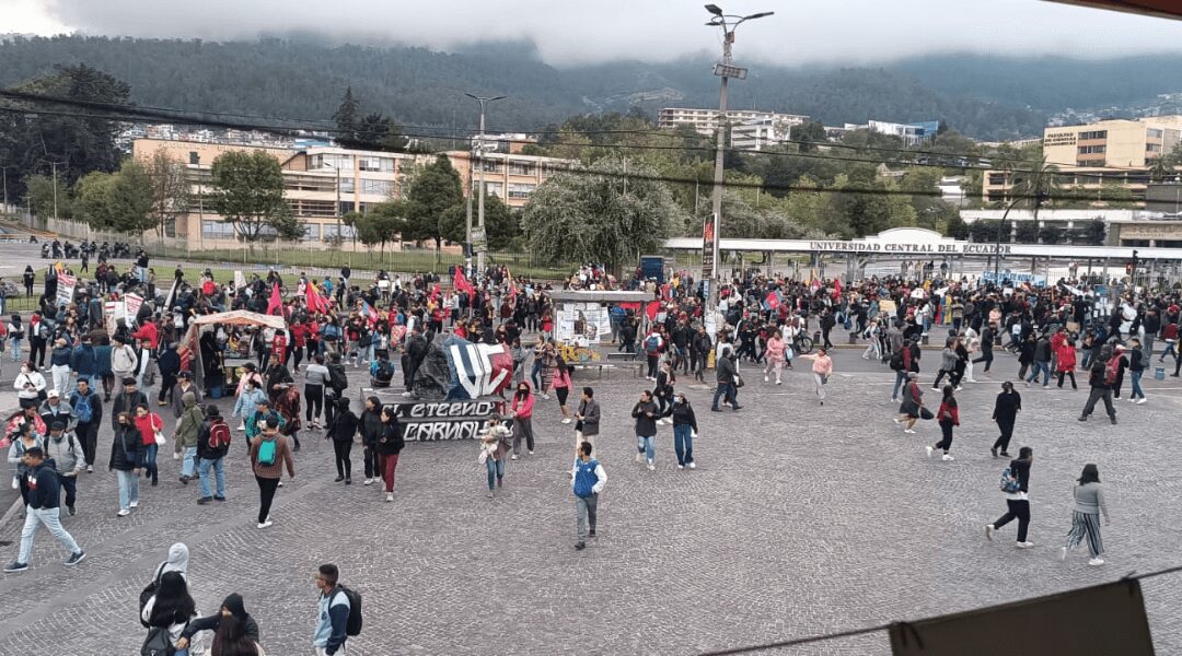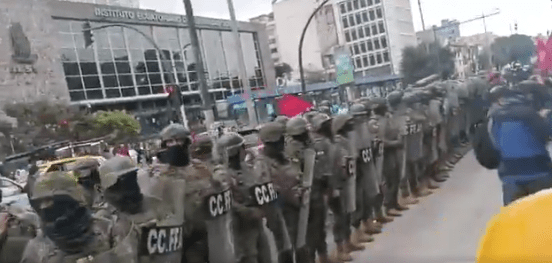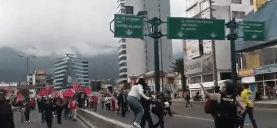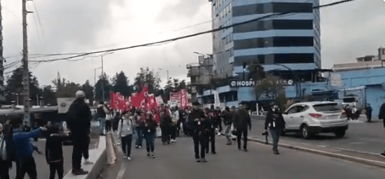 Esta tarde, la marcha de los sectores sociales prevista a desarrollarse en la Caja del Seguro, en Quito, enfrentó un gran despliegue militar y policial en la zona. Desde antes del inicio de la marcha, los militares requisaron a los manifestantes. También, evitaron que se cierre al tránsito la avenida 10 de agosto, y fueron dispersando la marcha.