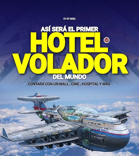 Una noticia sobre un proyecto del primer hotel volador se ha viralizado en diferentes redes sociales. Por ejemplo, se dice, tendría la capacidad para 5.000 pasajeros, contaría con un centro comercial, un polideportivo con gimnasio y piscina; restaurantes, bares, una zona de juegos para niños, un cine, un teatro, un hospital, entre otras instalaciones. Además, se señala que podría estar listo entre el 2030 y 2040 y que funcionaría con un reactor nuclear. Esta información es cierta.