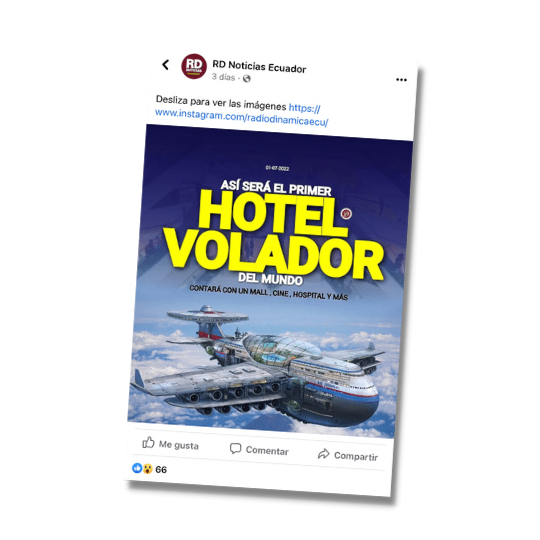 Una noticia sobre un proyecto del primer hotel volador se ha viralizado en diferentes redes sociales. Por ejemplo, se dice, tendría la capacidad para 5.000 pasajeros, contaría con un centro comercial, un polideportivo con gimnasio y piscina; restaurantes, bares, una zona de juegos para niños, un cine, un teatro, un hospital, entre otras instalaciones. Además, se señala que podría estar listo entre el 2030 y 2040 y que funcionaría con un reactor nuclear. Esta información es cierta.