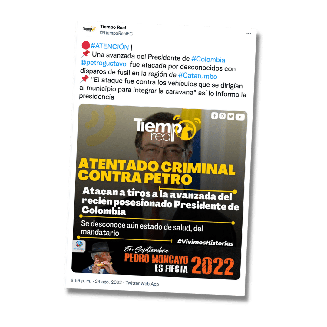 En la red social Twitter circula una imagen que asegura que atacan a tiros a la avanzada del recién posesionado presidente de Colombia. Sin embargo, el post afirma también que se desconoce el estado de salud del mandatario. Esta información es imprecisa, el ataque sí se dio, pero Petro no estuvo involucrado y nunca estuvo en duda su estado de salud.