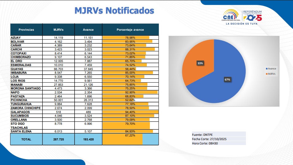 El informe del Departamento Nacional de Procesos Electorales (Dntpe), señala que de los 287.725 MJRV designados para el referendo y consulta, 193.420 ya fueron notificados. Las provincias con mayor avance son Galápagos, con 94%; Napo, con 92% y Carchi con 88%; mientras que el menor porcentaje se registra en Pichincha, con 52 %.