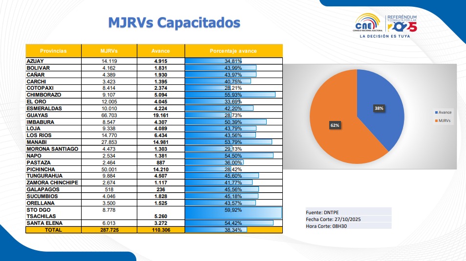 En cuanto a la capacitación, 110.306 MJRV han completado el proceso, lo que representa un avance del 38,34 %. Las provincias con mejores resultados en esta fase son Santo Domingo de los Tsáchilas, con 59,92 %; Santa Elena, con 54,42 %; y, Manabí, con 53,79 %. En contraste, Cotopaxi alcanza el 28,71 % y El Oro, 33%.