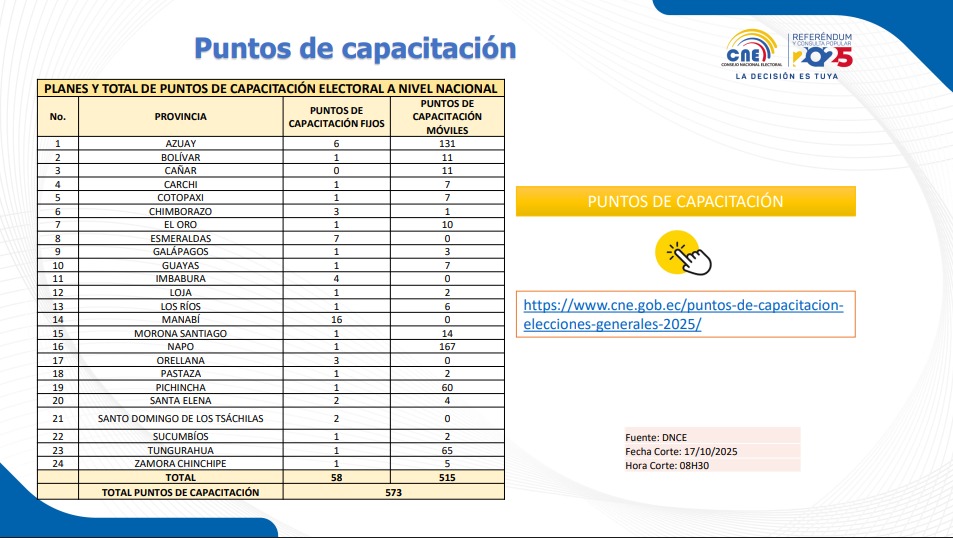 El CNE también informó que existen 573 puntos de capacitación en todo el país, según el registro de la Dirección Nacional de Capacitación Electoral, DNCE, con corte al 17 de octubre de 2025.