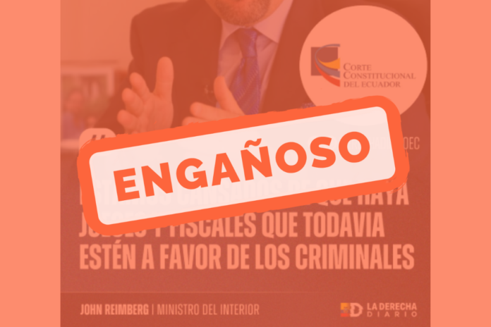 Aunque la frase atribuida al ministro del Interior, John Reimberg, es real y fue pronunciada durante una entrevista en Teleamazonas, la publicación verificada resulta engañosa al acompañarla con el logo de la Corte Constitucional.