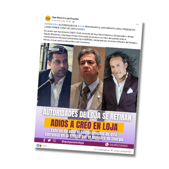 En junio del 2021, los dirigentes de CREO ya se pronunciaron sobre una designación de cargos. Un año después el revuelo vuelve. Una página de Facebook publicó que las autoridades de Loja: (Rafael Dávila, prefecto de Loja y presidente provincial de CREO; Marcelo Mencino, gobernador de Loja y Santiago Erraéz, concejal del movimiento) renuncian al movimiento CREO, debido a una designación dentro del Ministerio de Energía. La información es imprecisa. Todo se dio tras un escándalo de un video filtrado. Pero, Dávila renunció sólo a su cargo como presidente del movimiento en Loja y no se desafilió de CREO. Erraéz sí comunicó su renuncia al partido político. Mientras que, Mario Mancino no ha declarado nada públicamente.
