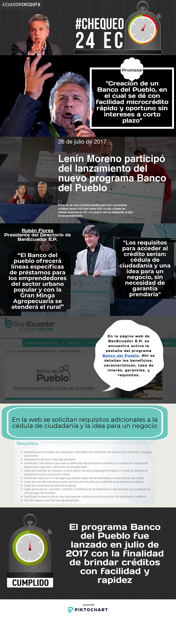 El 26 de julio de 2017, en Guayaquil, el presidente Lenín Moreno participó en el lanzamiento del nuevo programa Banco del Pueblo. A través de esta iniciativa BanEcuador E.P. concedería créditos desde USD 600 hasta USD 15.000, a tasas de interés menores al 10%, con plazos que se adaptarán al tipo de emprendimiento. El día de la presentación se entregaron USD 751.989, repartidos entre cuatro asociaciones y una persona.
