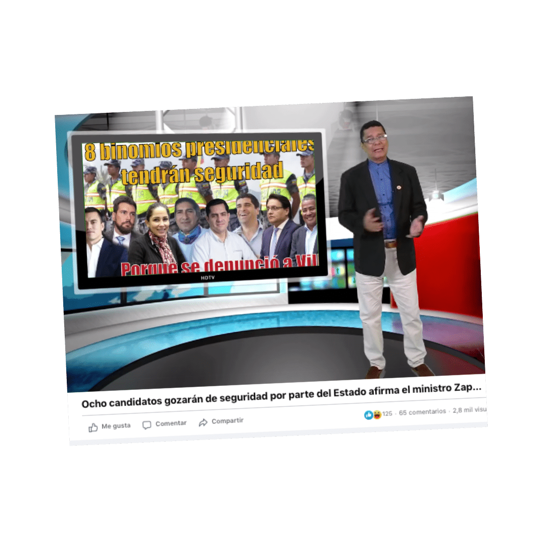 Este es el caso de una publicación realizada por la página de Facebook ‘Hechos Ecuador’. En esta se asegura que los ocho binomios presidenciales contarán con seguridad policial tras denuncias realizadas contra el candidato presidencial Fernando Villavicencio. Esto, haciendo referencia a publicaciones en redes sociales, que acusaban al presidente, Guillermo Lasso, de otorgar escolta al candidato. La publicación cuenta con más de 120 reacciones, 60 comentarios y 30 compartidos.