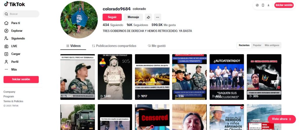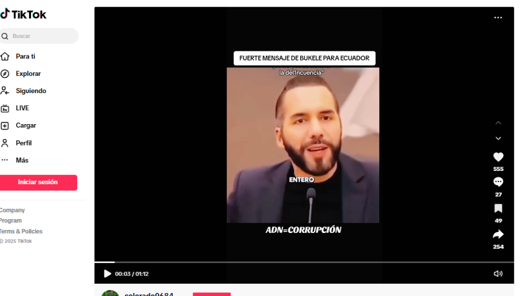 El contenido aparece, entre otros, en el perfil “colorado9684” de TikTok. Circula desde abril de 2025, en el contexto electoral ecuatoriano. Ninguna de las publicaciones enlaza al material original ni aporta fecha o fuente verificable.