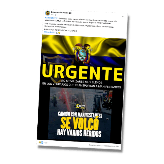 Un camión que circulaba por la avenida Pedro Vicente Maldonado, en el sur de Quito, se volcó en el sector de Tanasa. El siniestro vial se registró a la altura de la calle Ayapamba. El camión tenía una pancarta en la parte delantera que decía: “Presentes al paro, fuera Lasso”. En la red social Facebook, circula una publicación, en la que menciona, que un camión se volcó con varios manifestantes. Esta información es cierta. El cuerpo de Bomberos de Quito confirmó este incidente.