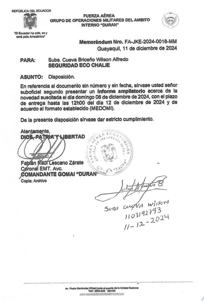 Hasta ese momento, no existía ningún registro oficial de la operación «Tango Charly». Pero el silencio administrativo se rompió gracias a una orden directa que consta en el Cuerpo 28 del expediente. El Comandante del GOMAI Durán, Coronel Fabián Raúl Lescano Zárate, emitió el Memorando Nro. FA-JKE-2024-0018-MM, dirigido al Suboficial Wilson Cueva Briceño. La disposición fue clara: le ordenaba presentar un informe ampliado acerca de la novedad suscitada el día domingo 08 de diciembre de 2024, dándole un plazo de 24 horas para entregar su versión escrita.