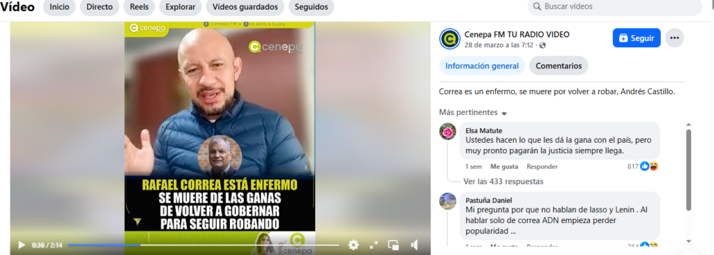 En el contenido se asegura que Castillo afirmó que Correa “está enfermo” y que su intención de volver al poder sería “para seguir robando al pueblo ecuatoriano”.