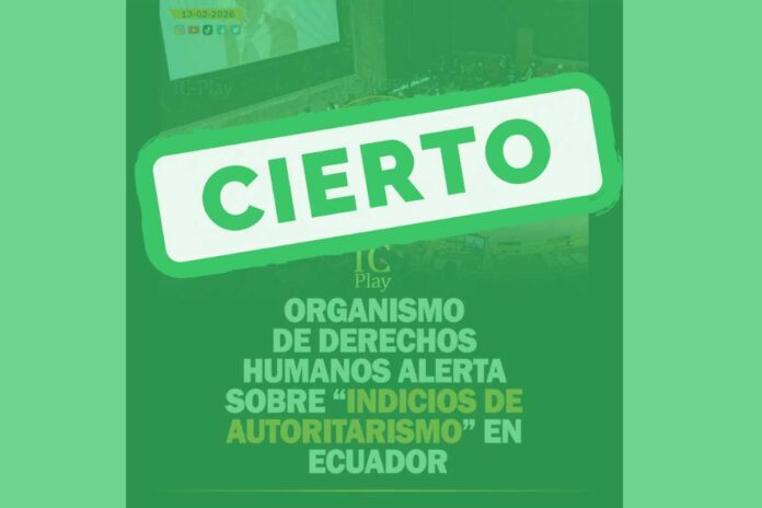 Una publicación en Facebook de la página IC Play asegura que un organismo de derechos humanos alertó sobre “crecientes indicios de autoritarismo gubernamental” en Ecuador. Esto es cierto: el Comité Permanente por la Defensa de los Derechos Humanos (CDH) difundió un pronunciamiento oficial el 12 de febrero de 2026 con esa frase y con señalamientos sobre presunto uso del aparato estatal y del sistema de justicia, el contexto de militarización por la crisis de seguridad, y el registro de “al menos 44” personas detenidas y luego desaparecidas tras operativos militares, según su reporte. Esa cifra forma parte del documento del CDH y corresponde a su reporte, no a un balance oficial del Estado.