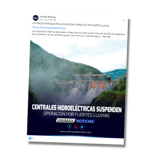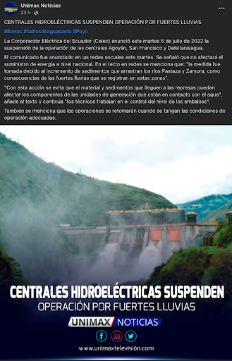 Una publicación en Facebook asegura que las centrales hidroeléctricas Agoyán, San Francisco y Delsitanisagua suspendieron su operación por las fuertes lluvias. Esta información es cierta.