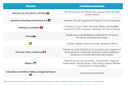 Hasta ahora existen 8 propuestas de estas 2 son ecuatorianas, las demás son extranjeras. La rehabilitación del ferrocarril costaría 2.500 millones de dólares.