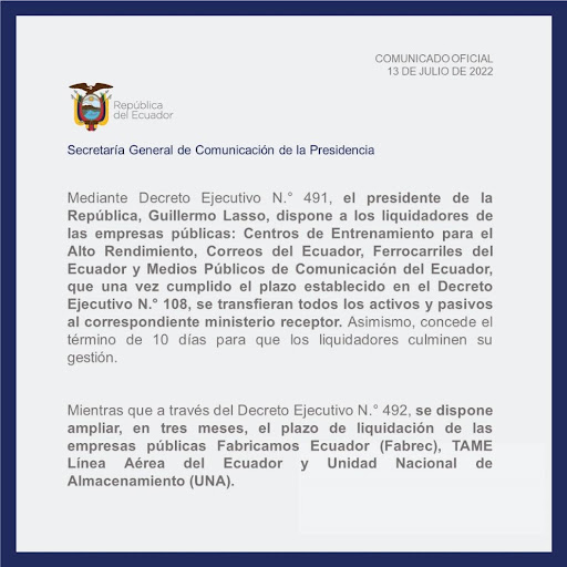 En el 491, Lasso dispone a los liquidadores de varias empresas públicas, entre las que consta ‘Ferrocarriles del Ecuador’, transfieran todos los activos y pasivos al correspondiente ministerio receptor. Y da un plazo de 10 días para que se culmine su gestión.