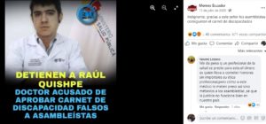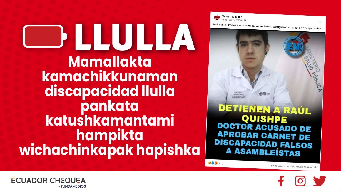 Facebook pankapimi shuk rikchata lluchishka nishpa:”Raúl Quishpe hampik huchachishka kan mamallakta kamachikkunaman discapacidad pankata katushka”. Chay willayka llullami kan shinallatak chay rikchapika españamanta yuotuber Auronplay runatami churashka.