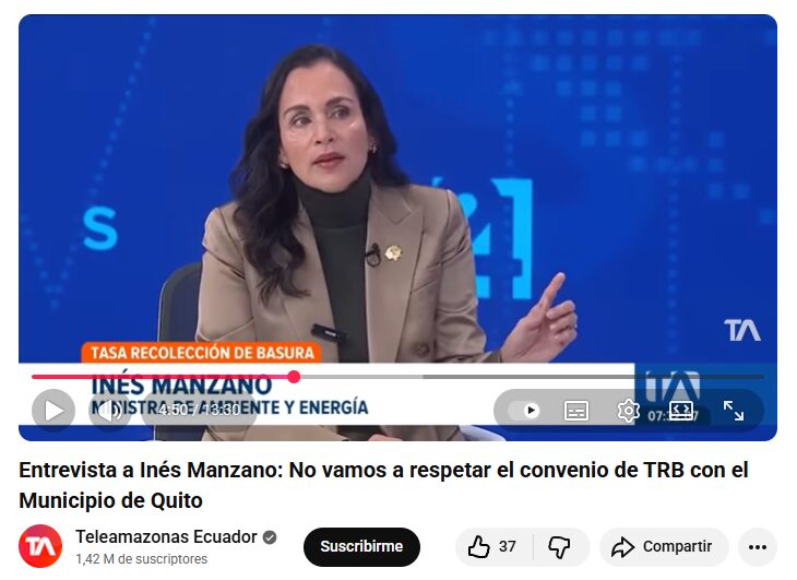 La mañana del 14 de octubre de 2025, en una entrevista con Teleamazonas, la ministra de Ambiente y Energía, Inés Manzano, se refirió a la eliminación de la tasa de recolección de basura en las facturas de electricidad.