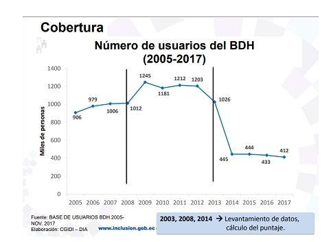 El MIES, en su ‘Evaluación de resultados e impacto del Bono de DesarrolloHumano (BDH)’, sostiene que, entre noviembre de 2016 y noviembre de 2017, el número de beneficiarios del bono se redujo. Además, en ese periodo, el presupuesto del BDH disminuyó en aproximadamente USD 6 millones. Pese a que existió un aumento en los valores entregados por concepto de BDH, se restó el número de usuarios y el presupuesto asignado al mismo.