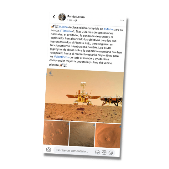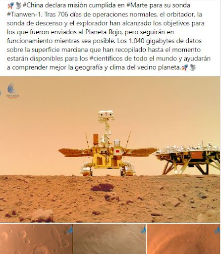 Una publicación en Facebook asegura que China declaró misión cumplida en Marte para su sonda Tianwen-1. En el post se menciona que, después de 706 días de operaciones normales, el orbitador, la sonda de descenso y el explorador alcanzaron los objetivos para los que fueron enviados al planeta rojo, pero seguirán en funcionamiento mientras sea posible. Además, señalan que los 1.040 gigabytes de datos sobre la superficie marciana que se han recopilado hasta el momento estarán disponibles para los científicos de todo el mundo y ayudarán a comprender mejor la geografía y el clima del planeta vecino. La información es cierta.