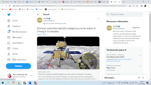 En Facebook esta circulando una imagen en la que menciona que China halla vestigios de agua autóctona en la superficie de la Luna. Esta información es cierta. Así lo confirmó el medio Nature Communications, en el que menciona que lograron identificar al menos dos fuentes de procedencia: agua traída por vientos solares y otra autóctona de la Luna.