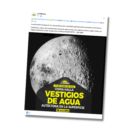 En Facebook esta circulando una imagen en la que menciona que China halla vestigios de agua autóctona en la superficie de la Luna. Esta información es cierta. Así lo confirmó el medio Nature Communications, en el que menciona que lograron identificar al menos dos fuentes de procedencia: agua traída por vientos solares y otra autóctona de la Luna.