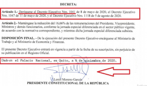 El 12 de abril, 42 días después de anunciado el primer caso de Covid-19 en Ecuador y 26 días después de declarada la emergencia sanitaria en todo el Ecuador, el Presidente Lenín Moreno planteó la reducción del 50% de su sueldo y el mismo destino tuvieron el vicepresidente, ministros y viceministros. Dicho Decreto que ordena esa medida fue el número 1041 y fue firmado el viernes 8 de mayo del 2020, cuando entró en vigencia la reducción salarial.