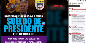 El post utilizado por la publicación en la cuenta Facebook de la UNE fue una composición de la publicación la cuenta twitter del diario El Comercio de Ecuador el día 10 de noviembre, además de los renglones anexados por el gremio educativo quienes denuncian que los “sueldos de los empleados públicos siguen recortados”.