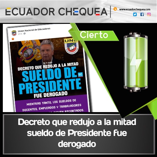 En este contexto, desde la cuenta de Facebook de la Unión Nacional de Educadores de Ecuador (UNE), circuló desde este 10 de noviembre la noticia que el presidente Lenín Moreno derogó dicho decreto para restaurar su sueldo. La información es cierta y ocurre en un momento que ha habido quejas de pagos pendientes en el sector público o falta de transparencia en el uso de recursos en el viaje de la vicepresidenta María Alejandra Muñoz al Vaticano.