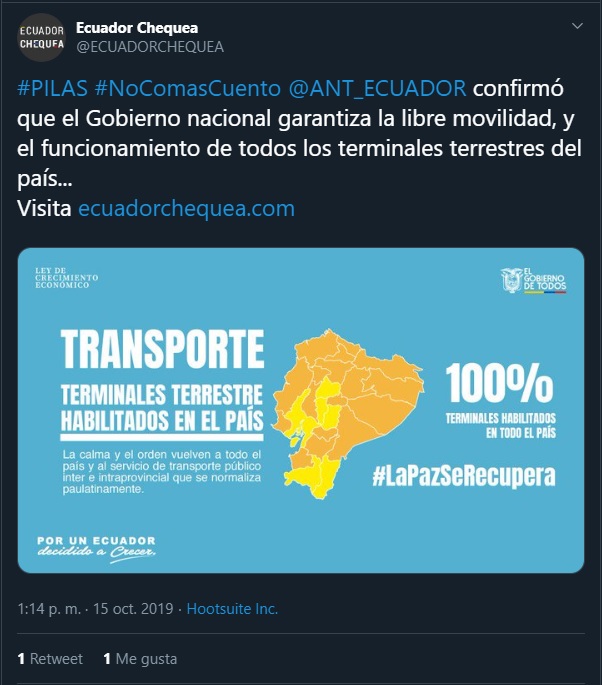 Las operaciones de traslado de carga y de pasajeros fueron suspendidas producto de las protestas en varias vías nacionales, que produjo la declaración del estado de excepción por parte del Gobierno Nacional el día lunes 7 de octubre, al 4 día de protestas y manifestaciones.