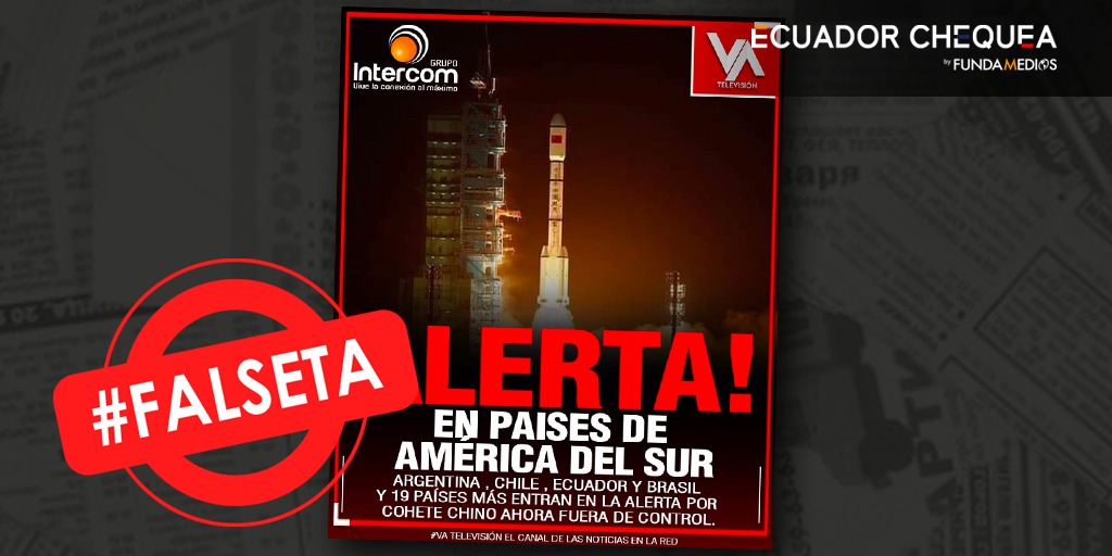 En Facebook y en WhatsApp circula una imagen que asegura que “un gran cohete chino está fuera de control” y que Argentina, Chile, Ecuador, Brasil y 19 países de Sudamérica son posibles puntos de impacto y estarían en alerta ante este hecho. La información es falsa porque no se ha determinado el lugar de caída del cohete y expertos señalan que no hay peligro para la ciudadanía.