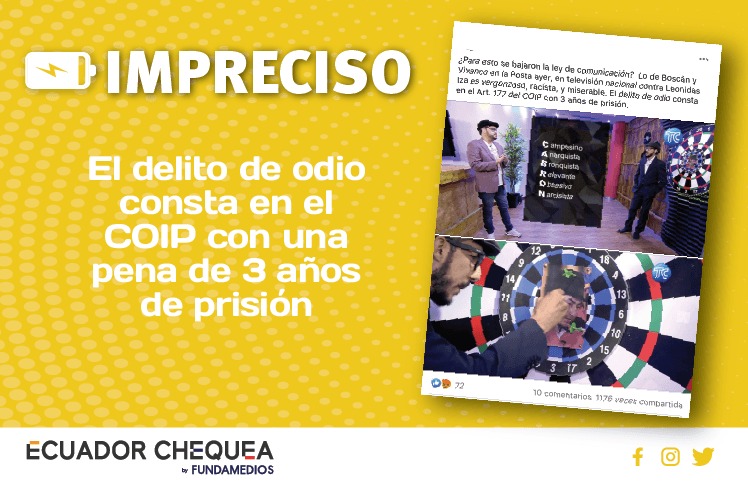 En una cuenta personal de Facebook circuló una publicación con la fotografía de Andersson Boscán en el programa “La Posta XXX” de Tc Televisión, que se estrenó el domingo 4 de julio. La foto tenía la siguiente descripción: “¿Para esto el gobierno se bajó la ley de comunicación? Lo de Boscán y Vivanco en la Posta ayer, en televisión nacional contra Leonidas Iza es vergonzoso, racista, y miserable. El delito de odio consta en el Art. 177 del COIP con una pena de 3 años de prisión.” Esta información es imprecisa. La sentencia que el COIP establece para la pena de odio es de 1 a 3 años de prisión.