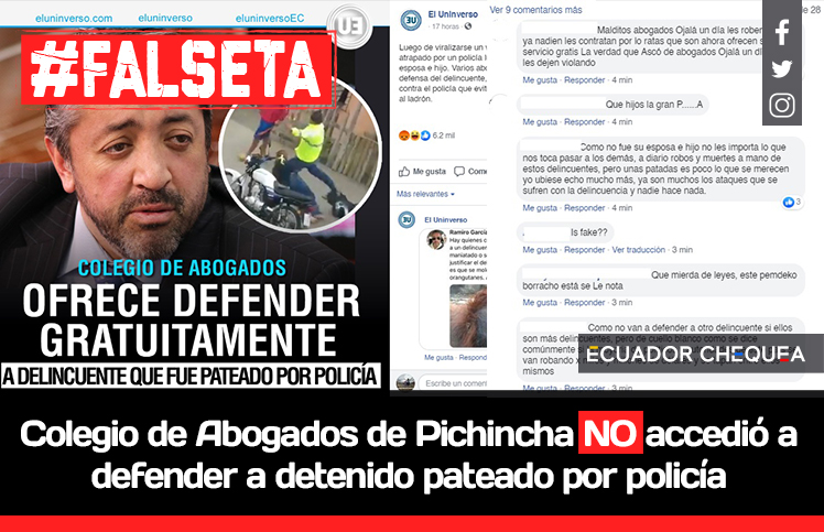 La información engañosa fue desmentida por el mismo García a través de su cuenta de Twitter. De acuerdo al jurista, pese a que está en desacuerdo con el accionar del agente, jamás ha “propuesto que el Colegio de Abogados de Pichincha asuma su defensa gratuita».
