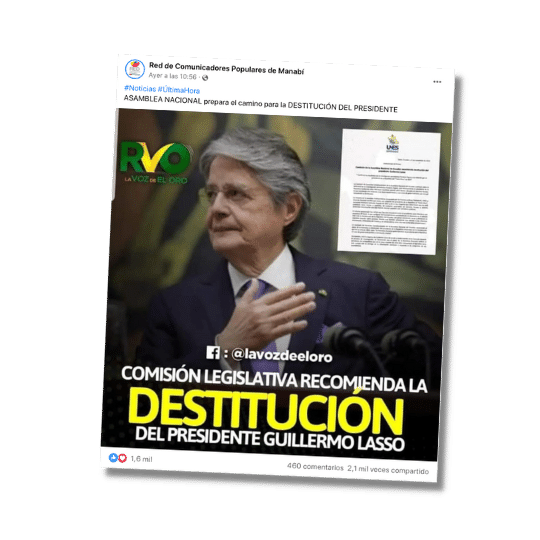 Mientras en el país se viven días de tensión debido a las movilizaciones anunciadas por la Conaie, en la red social Facebook está circulando una imagen en la que se afirma que una comisión legislativa recomienda la destitución del presidente, Guillermo Lasso. Esta información es falsa.